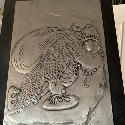 R. Svedberg reliefplatta i metall med figurmotiv. Rektangulär väggplatta med upphöjt motiv föreställande en sittande figur som blåser i ett horn. Plattan är signerad nertill och har stämplar som anger tillverkare. Passar som väggdekoration i hem- eller kontorsmiljö.