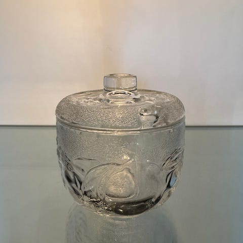 Glasburk med lock på fot i klart glas med räfflad dekor. Burken har rund fot och kupat lock med knopp. Höjden framgår av bild med måttband och diametern upptill visas i separat bild. Passar exempelvis för förvaring av godis, kakor eller frukt, eller som dekorationsskål.