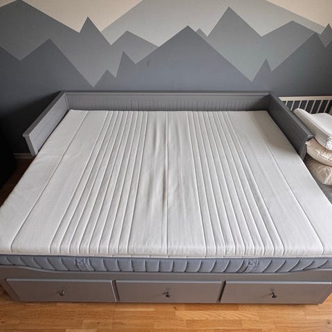 Säljes som nyskick IKEA HEMNES, 3 lådor, vit, 2st madrasser, Mått 80 x 200 cm, Höjd 83 cm, Full bäddbredd 160 cm