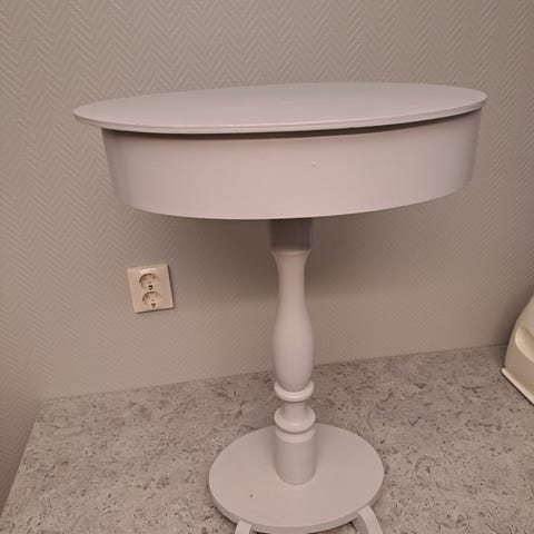 Sängbord eller sidobord i vitt trä. Bordet har fyrkantig bordsskiva, fyra raka ben och en utdragbar låda med knopphandtag på framsidan. Passar som nattduksbord bredvid säng eller som litet avlastningsbord i vardagsrum eller hall.