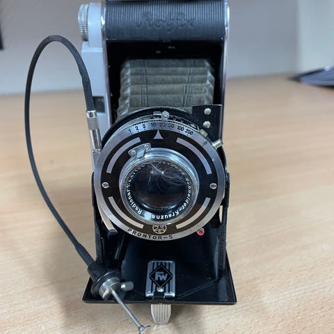 Agfa Isolette bälgkamera med väska i mycket fint skick samt några blixtara med blixtlampor samt en gammal fotolampa.