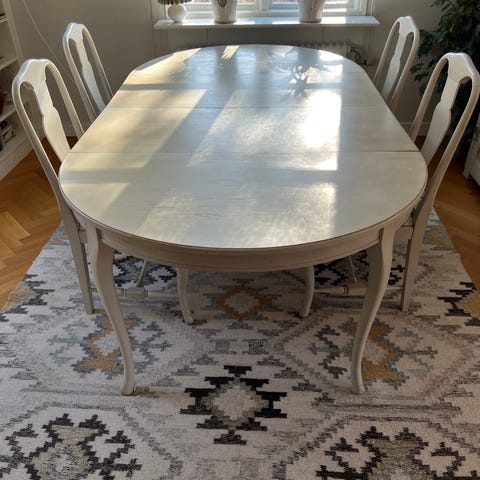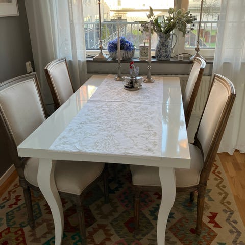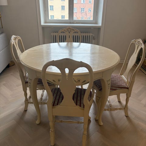 Vackert utformat med mjuka, svängda former, snidade detaljer och karaktäristiska cabrioleben som ger ett tidlöst och dekorativt uttryck. Den vita finishen lyfter fram formerna och gör setet lätt att kombinera i både klassiska och mer moderna hem.
