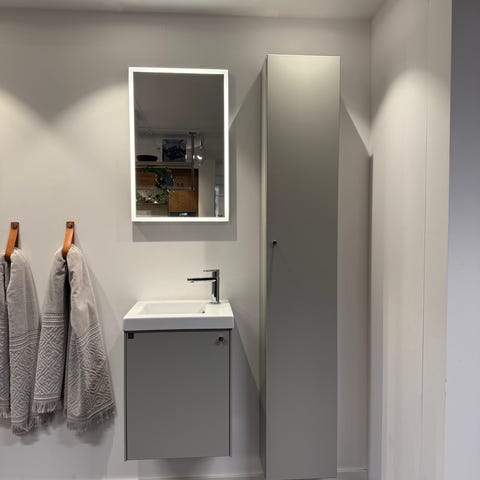 Badrumsmöbel set bestående av kommod med tvättställ, spegelskåp och högskåp i svart utförande. Kommoden har integrerat handfat och förvaring under. Spegelskåpet är väggmonterat med spegeldörrar och belysning ovanför. Högskåpet är smalt och högt med förvaringsutrymme för badrumsartiklar. Passar för montering i badrum med duschhörna. Ytskikten är i mörk färg och tvättstället är i vitt porslin eller motsvarande material.