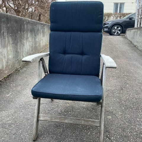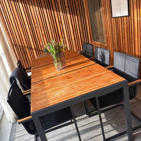 Trädgårdsgrupp med ett bord och fyra stolar i teak.