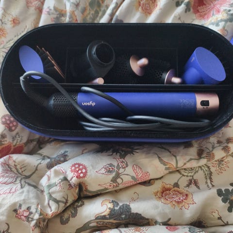 Dyson Airwrap ”complete long”. Köpt på blocket för ett år sedan och använd ett par gånger. Men jag stylar mitt hår för sällan för att det ska kännas värt att ha kvar den. På bilden syns de delar som ingår.