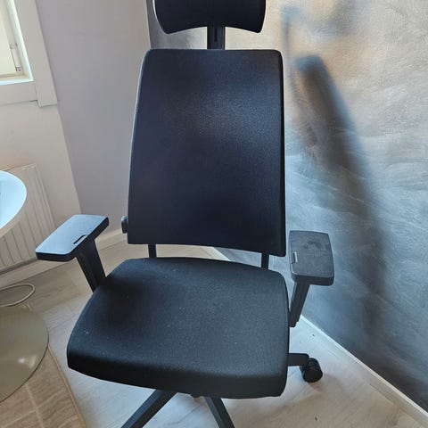 Ergonomisk kontorsstol Opus Sixten i bra skick. Stolen är klädd i svart tyg med sömmar och har en robust konstruktion samt en karakteristisk T-formad rygg som ger många sittpositioner och bra stöd för ryggen.