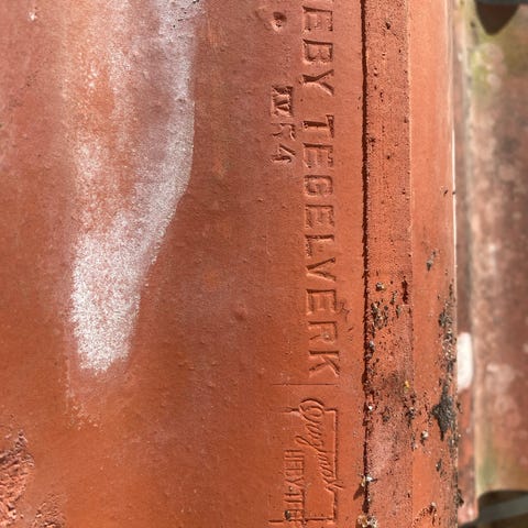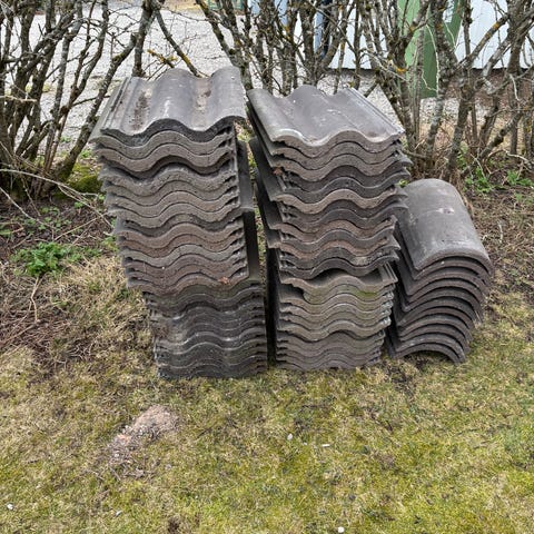 Cirka 200 takpannor i betong från Ekenäs. Finns också ett tjugotal nockpannor. Byggbredd cirka 30 cm.