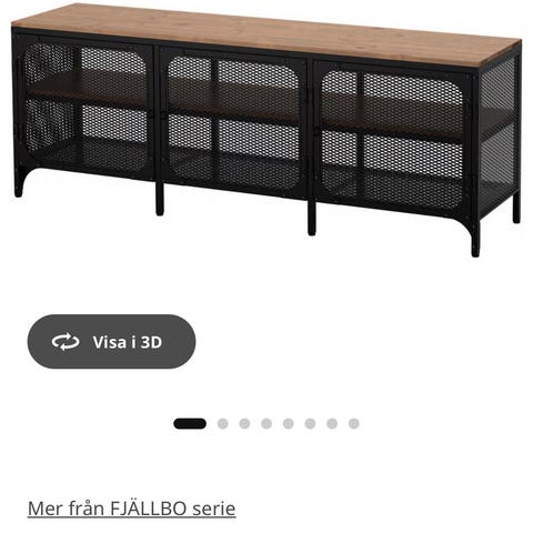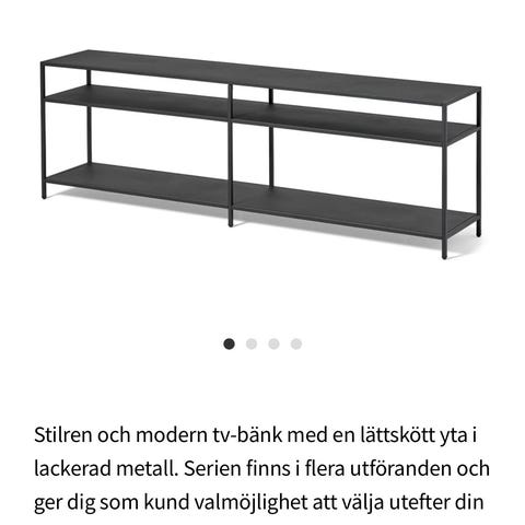Ikea tv-bänk i svart metall. Tv-bänken har skåpsförvaring med dörrar i metallnät och en öppen baksida som underlättar kabeldragning till tv och annan elektronik. Passar som mediabänk eller förvaringsmöbel i vardagsrum.
