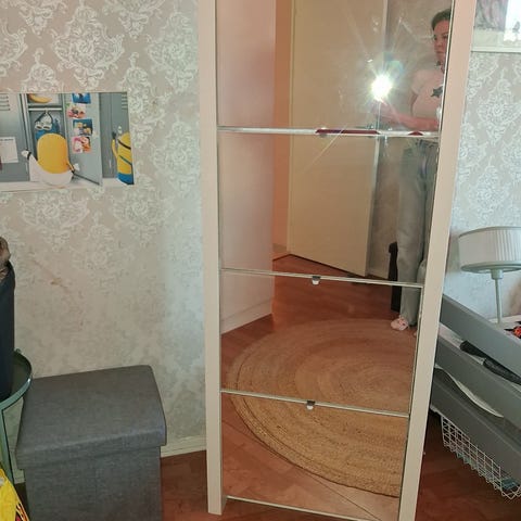 Skoskåp med spegeldörrar i vit stomme. Skåpet har flera hyllplan på insidan som kan användas för förvaring av exempelvis skor, kläder och andra accessoarer. Passar i hall, sovrum eller klädkammare där det finns behov av förvaring och helkroppsspegel i samma möbel.