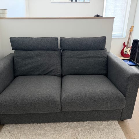 Soffan är stabil och skön, men tyget är smutsigt/slitet och behöver rengöring eller nytt överdrag.