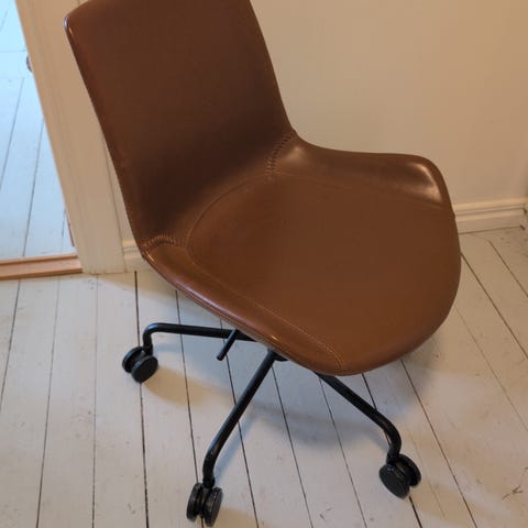 Säljer en snygg och bekväm kontorsstol i brun läderlook. Funkar perfekt till hemmakontoret eller skrivbordet.