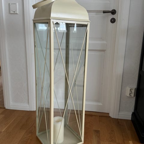 Stor lykta med dörr och låda i botten, ben av trä och plåtskodd tak. 120cm hög, 41cm bred.