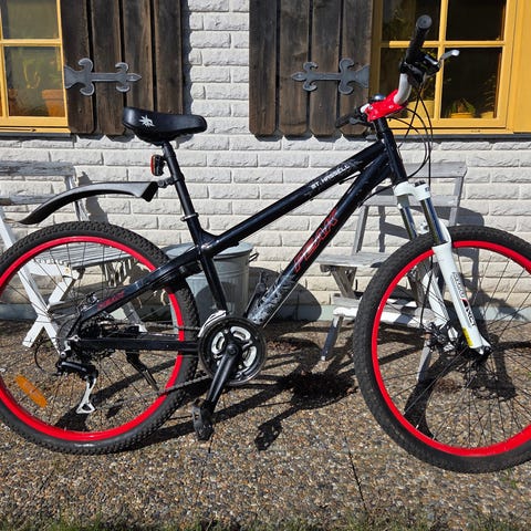 Peak mountainbike med 26" hjul. Cykeln är 21-växlad. Lämplig som ungdomscykel eller flickcykel ca 9-13 år (en gissning). För tuff användning på blandat underlag. Mycket sparsamt använd av dottern. Har inte gått många mil, mycket fin.