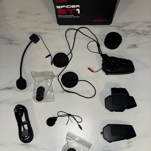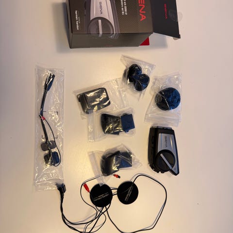 Sena 20S Evo intercom dual för motorcykelhjälm. Paketet innehåller två intercomenheter med tillhörande mikrofoner, högtalare och fästen för montering i hjälm.