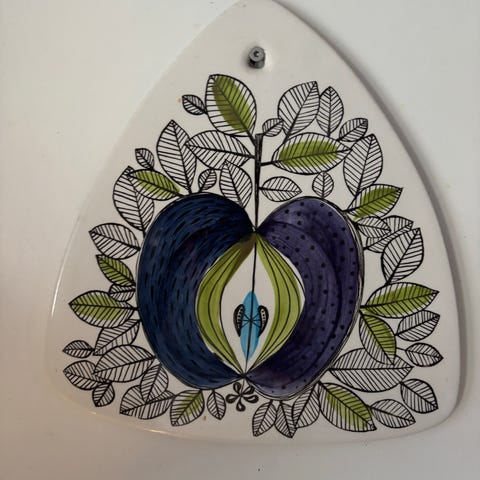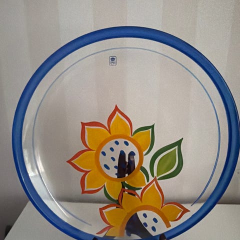 Ett fat från SMF Schramberg med "Rosen"-mönster. Fatet har en svart botten med en vit rand dekorerad med gula och röda rosor samt gröna blad. Märkt undertill med "SMF Schramberg", "Jaspisemalt", "13", "Dec.", och "Rosen".Mått bredd 26 cm*27 cm.