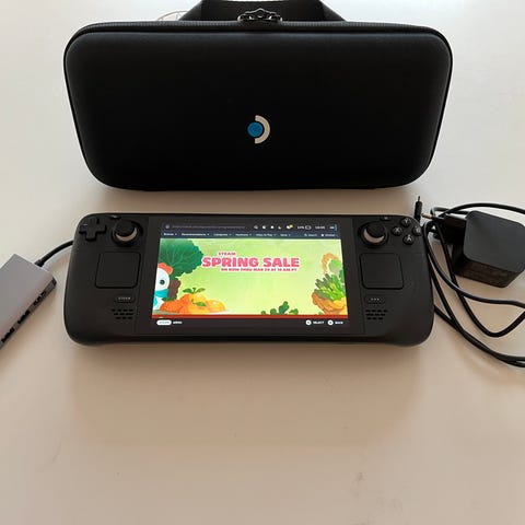Valve Steam Deck handhållen spelkonsol i svart färg. Konsolen levereras med originalförvaringsväska, nätadapter/laddare och USB‑kabel enligt bilder. Layout med styrspakar, styrkors, knappar och pekplattor på framsidan. Lämplig för bärbart spelande och anslutning till Steam-konto för digitala spel. Modellinformation och serienummer framgår på originalkartongen på bilden.