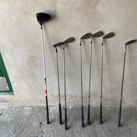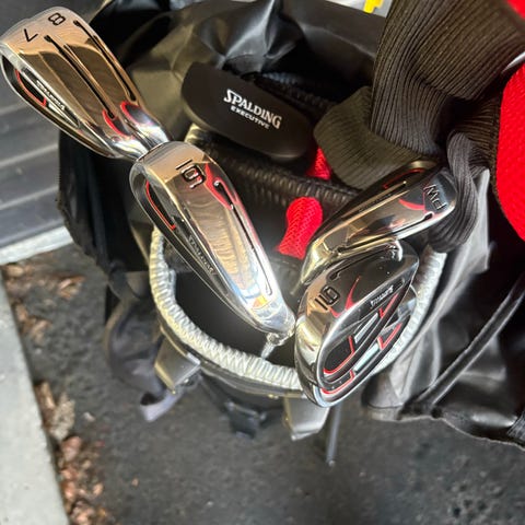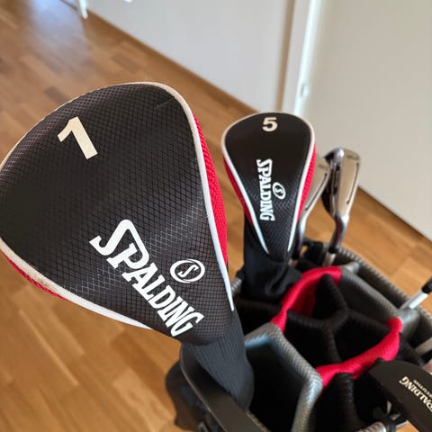 Spalding golfset med golfbag och klubbor i svart/röd färg. Setet inkluderar en ståbag med utfällbara ben . Passar för golfspelare som söker ett komplett set med bag och klubbor för spel på bana eller träning på range. Perfekt för nybörjare.
