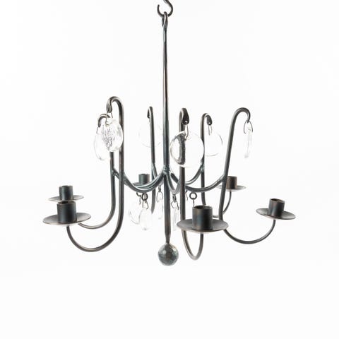 Kosta Boda takkrona i glas och metall. Ljuskronan har en rund metallram med plats för flera ljus samt dekorativa glaskupor och glaspärlor. Kedjor i metall används för upphängning i tak. Passar som belysning i exempelvis vardagsrum, matsal eller hall.