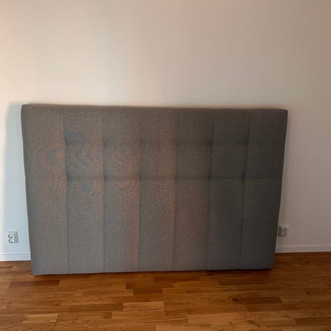 Grå sänggavel, kan stå på golv eller som vägghängd. Lite sliten i det svarta fältet nertill där sängarna gått emot men inget som syns.