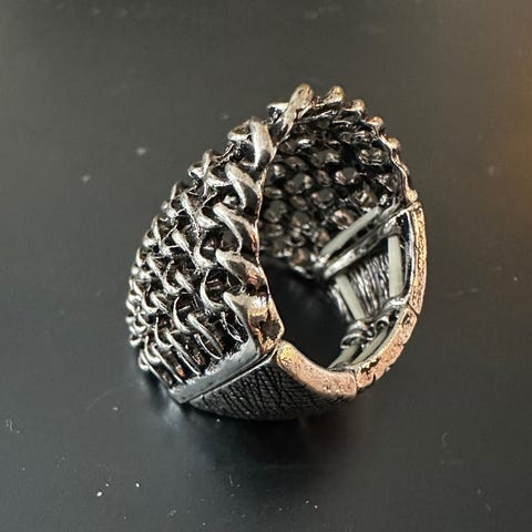 Ring med en stor blå sten i mitten omgiven av mindre vita stenar. Metallfärgad ring.