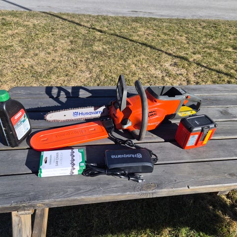 1 st batteri motorsåg som är körd 5 laddningar det medföljer några kedjor också ny pris Husqvarna 120i Batteridriven Motorsåg (inkl. batteri & laddare)
