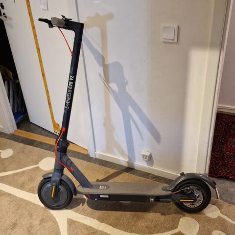 E-Wheels E2S V2 elsparkcykel i svart färg. Modellen har digital display på styret som visar hastighet och batterinivå. Elsparkcykeln är utrustad med handbroms, fotplatta med halkskydd och ihopfällbar konstruktion för enklare förvaring och transport. Passar för kortare pendlingssträckor och vardagsresor på cykelvägar och andra jämna underlag.