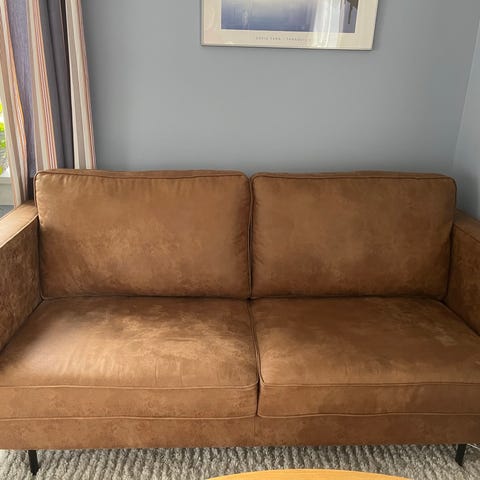 soffa med mocka tyg i sparsam skick