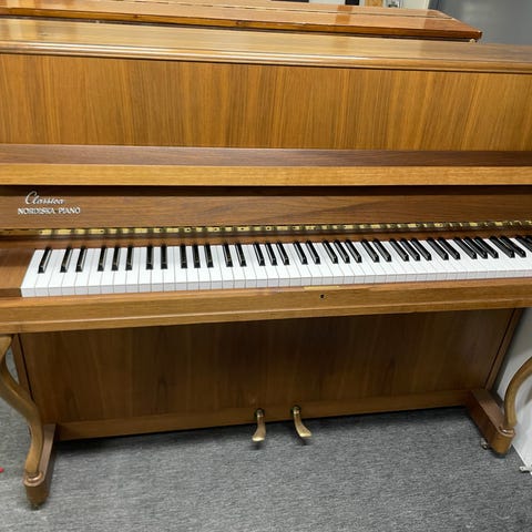 Nätt skolpiano i ljust träutförande från Nordiska Pianofabriken i Vetlanda, Sverige. Pianot står och används idag på Kulturskolan i Lidköping. Det är ett väl använt instrument med exteriör patina som har väldigt god potential - svensk kvalité, hel resonansbottnen och friska stämnaglar. Fin klang i den högre klassen med väldigt god basåtergivning.