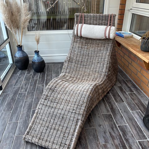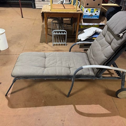 Solstol i trä med svart och grå dyna. Ryggstödet är ställbart och möbeln är avsedd för utomhusbruk, till exempel på balkong, altan eller uteplats. Dynan är vadderad för ökad sitt- och liggkomfort och är fäst på liggytan. Hjul på ena sidan lätt att flytta.