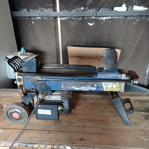 Nedergatans Maskiner HK50 vedklyv och vedkap i metall för hantering av ved. Vedklyven är blå och märkt med modell HK50, tillverkningsår 2022 och vikt 130 kg. Den är utrustad med hydraulik, elmotor och hjul för förflyttning. Vedklyven är avsedd för klyvning av vedträn i liggande läge.