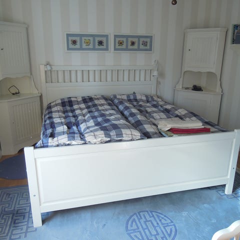 IKEA sängram i trä med måtten cirka 180x200 cm. Sängramen har en hög gavl med rundad överkant och vertikala ribbor. Utförande i ljus träfärg som passar i de flesta sovrum. Konstruktionen har ben i samma material och höjd som ger plats under sängen för exempelvis förvaring. Levereras som sängram utan madrass och sängkläder enligt bilderna. Lämplig för två standardmadrasser eller en dubbelmadrass i storlek 180x200 cm.