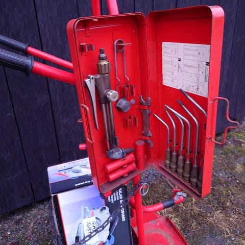 AGA svets- och skärutrustning för gas, inklusive två tryckregulatorer med manometrar, brännare med flera munstycken, gasslangar samt mindre tillbehör som tändare och rensnålar. Utrustningen levereras med en blå väska med fack för ordnad förvaring av delar och verktyg. Lämplig för olika typer av gas-svetsning och skärning där regulatorer, slangar och brännare för gas används.