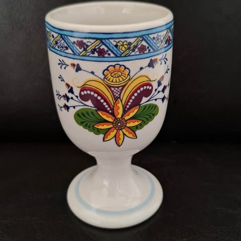 Ritzenhoff "Vis-a Vis" vas i vitt porslin med dekorränder i rött, gult, blått och grönt. Designad av Heinz te Laake. Vasen har en rund fot med samma färgade mönster som på vasens kropp. Passar för snittblommor eller som dekorativ inredningsdetalj.