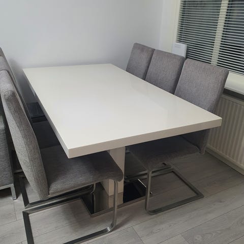 Matbord i vitt högglans 140x80 cm + 4 st bekväma stolar i beige sammet med mässing ben.