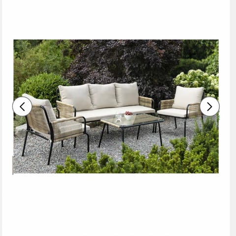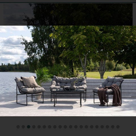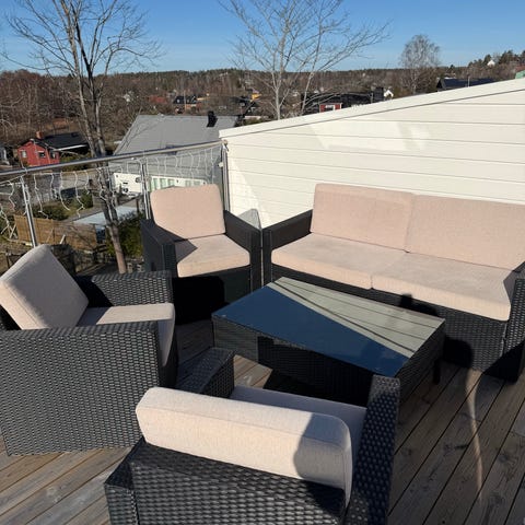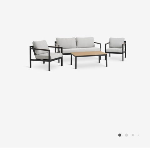 Utemöbelgrupp bestående av soffa och fåtöljer med tillhörande sitt- och ryggdynor. Stommarna är i metall i svart färg och dynorna är i beige tyg. Möblerna är avsedda för utomhusbruk, till exempel uteplats, altan eller trädgård. Gruppen ger sittplatser för flera personer och är anpassad för loungemiljö med låg sittkomfort för avkoppling utomhus. Tillhörande soffbord kommer med också.