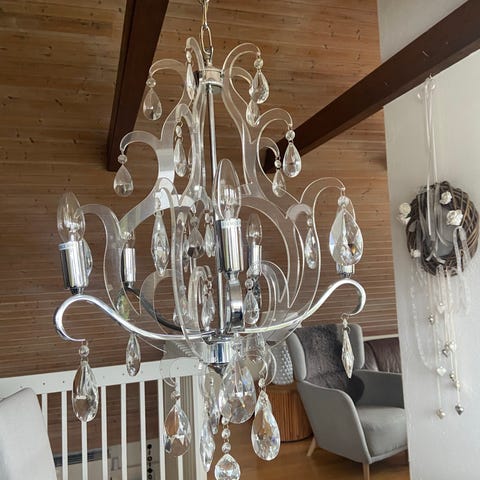 2 likadana ljuskronor från IKEA, höjd 60 cm från topp på kronan till lägsta prisma. Hängt uppe en tid, fint skick. Obs, har vanlig stickpropp och inte takuttag, vilket gör det enklare att hänga den varsomhelst, ex över soffhörn eller över sidobord. Fantasin sätter gränserna :)