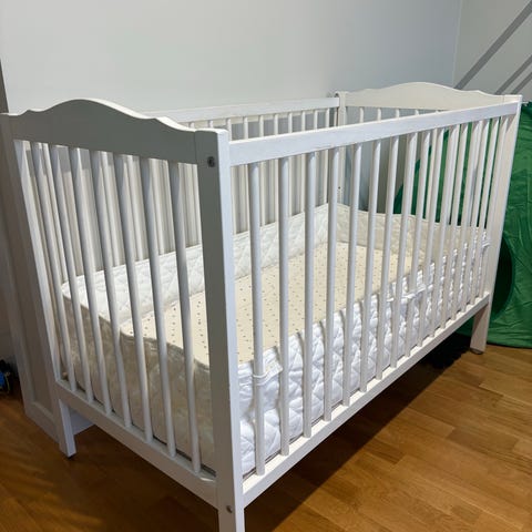 Spjälsäng från Nordbaby. Justerbar botten i tre höjdlägen: 23, 40 och 53 cm.