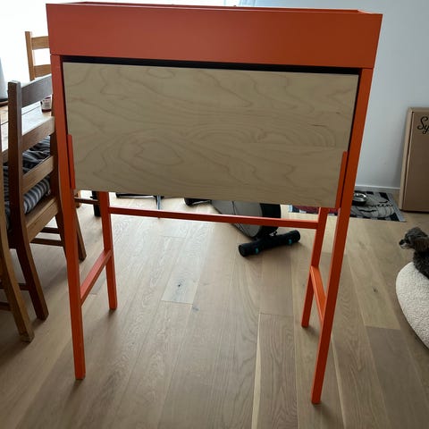 Plywood barstol, laminat i grå och rosa.