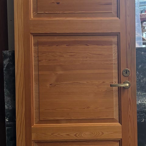 Innerdörrar i massiv furu. Karm med gångjärn och mässingsfärgade dörrhandtag ingår.