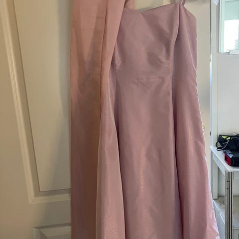 Balklänning i rosa utan axelband. Storleken tror jag är 34, vilket jag var vid den tiden. Jag är 166 lång och har 3 cm klack på de sista bilderna. Jag har använt den en gång och jag kan inte längre ha den. Överdraget medföljer.