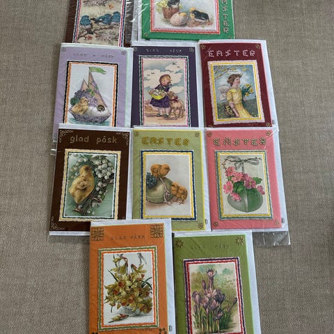11st dubbla och inplastade påskkort med gamla motiv som är glitterlimmade och har peel off stickers på sig.