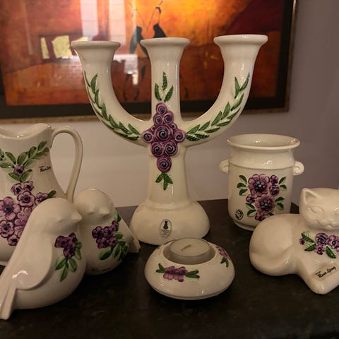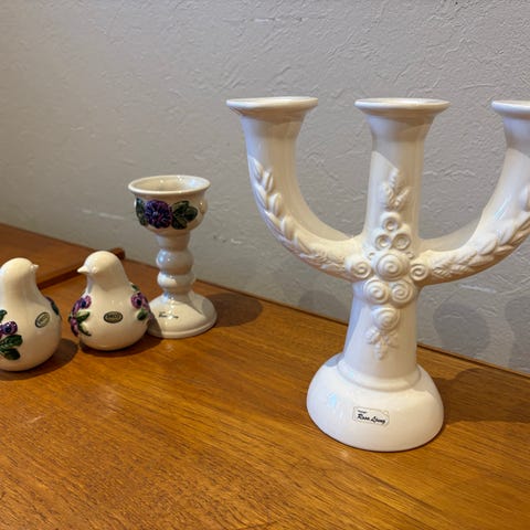 Rosa Ljung keramikset ljusstake skål fåglar vit lila