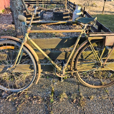Fin ommålad militärcykel, lite färgskav här och där, nya slangar och däck. Saknar lagringskit och pump i den obligatoriska "lådan". En rejäl cykel ifrån I4 i Linköping. Säljes i befintligt skick.