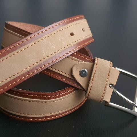 Färgglatt bälte med dubbla spännen och läderdetaljer med präglad logotyp.