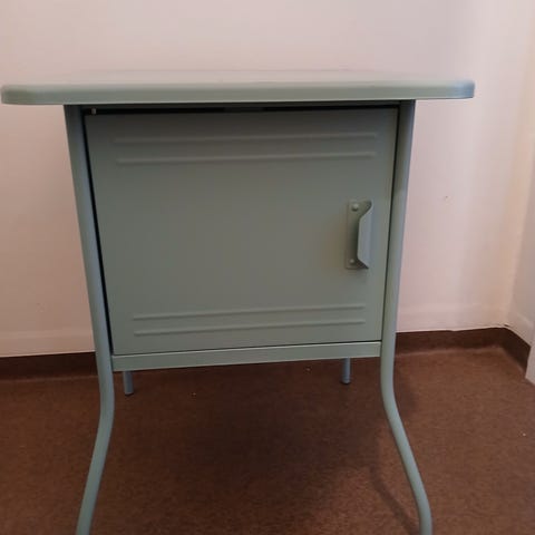 Charmigt sängbord/skåp som jag har haft ute på balkongen. Färgen har bleknat men det är i ok skick. Hjulen fungerar.