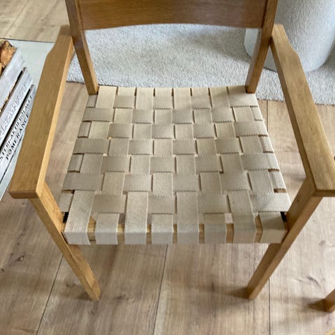 Stilrena matstolar i dansk design, av teak. Nyklädda sitsar i flätat mönster.
