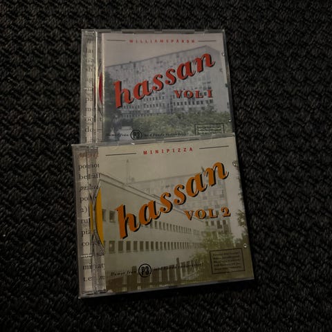 CD-skiva med Minipizza Hassan Vol 2. Innehåller 26 spår, bland annat "Taxi", "Mynthandeln", "Minipizza" och "Sista minuten-resa". Medverkande inkluderar Fredrik Lindström, Kristian Luuk, Henrik Schyffert, Erik Haag, Pontus Djanaieff och Felix Herngren. Utgiven av Silence Records.
