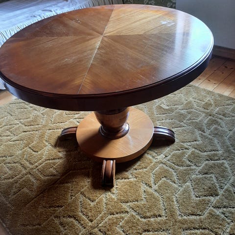 Runt matbord i mörkare trä med glasskiva. Är i mycket gott skick men finns enstaka repor, svåra att fånga på bild. Vänligen se bild 3.