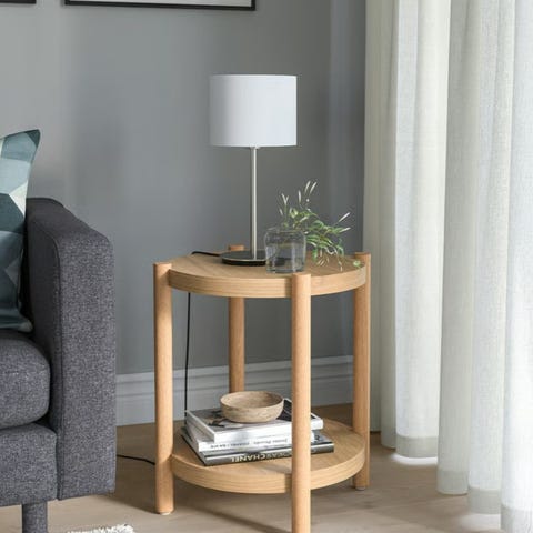 Två snygga förvaringsbord i svart metall och massiv furu (ljusbrunlaserad). Varje bord har avtagbar bordsskiva och en dold tygpåse för förvaring. Diameter 60 cm + 43 cm. Fungerar perfekt som soffbord, sängbord eller avlastningsbord.