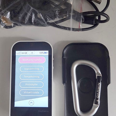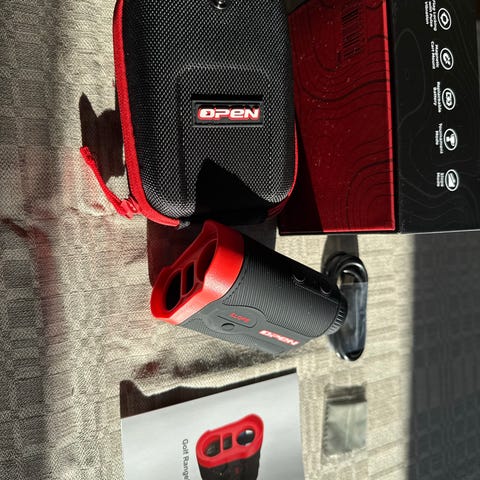 Rapsodo launch monitor med tillhörande skyddsfodral och USB‑kabel. Hållaren är utformad för att placera en smartphone upprätt. Fodralet är hårt med dragkedja och bärögla för förvaring och transport av enheten.